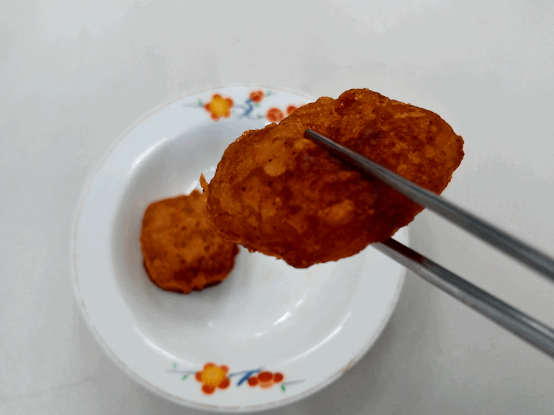 食べてみると、電子レンジでの調理なので、衣のカラッとした感じは薄めです。