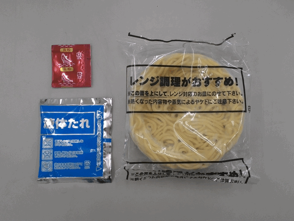 袋を開けてみると、内容物は麺、液体スープ、魚粉パックです。