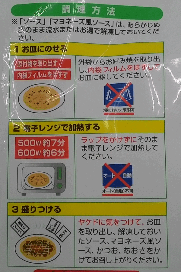 お好み焼は透明フィルムをはがしてお皿にのせてラップをかけずに電子レンジで温めます。