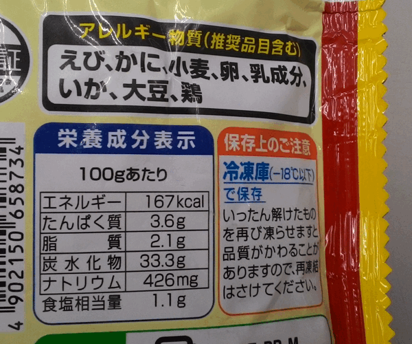 「8種の具材」ですが、いか、あさり、ピーマン、赤ピーマン、ひらたけ、乾燥トマト、マッシュルーム、この7つまでは「原材料名」の表記、仕上がったパエリアから確認できました。