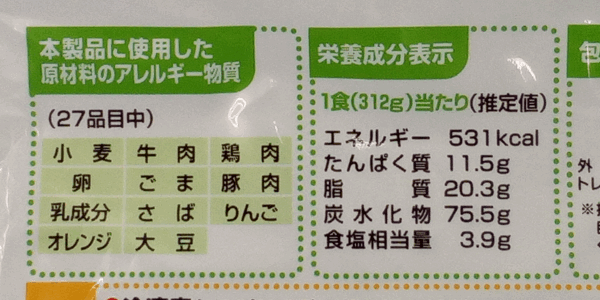 カロリー:1食(312g)当たり(推定値) 531kcal